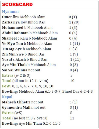 Nepal innings began with openers Gyanendra Malla and Mahesh Chhetri scoring three runs each. Nepal reach 6 runs from just two balls and it was matter of just a couple of more balls. But the Myanmar bowler Aye Min Than, probably to delay the inevitable, bowled three consecutive wides, the last of which was missed by the wicket-keeper with Nepal batsmen running two byes to end the match in just two balls.